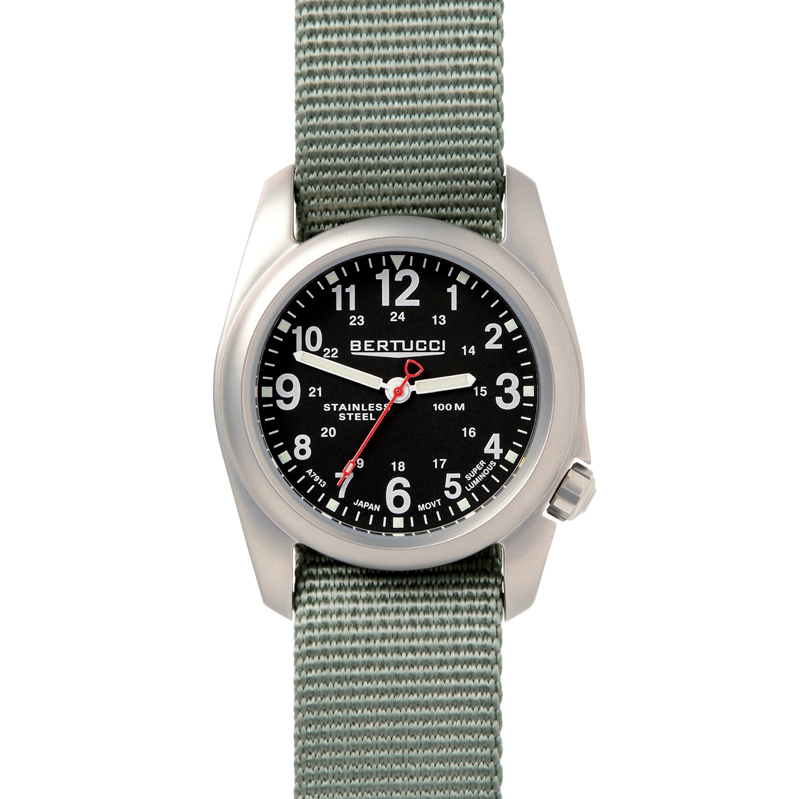 The A-2S Field™ is the quintessential Bertucci® Field Watch in a 40 mm brushed stainless steel case. Has all that in should in the highly functional design…offering value and long lasting durability. Equipped with rugged screw down crown & case back, 100 M water resistance, durable Unibody™ case, long lasting B-Type nylon band, R-Type mineral crystal, precision movement, Swiss super luminous hand & markers and 4 year battery.